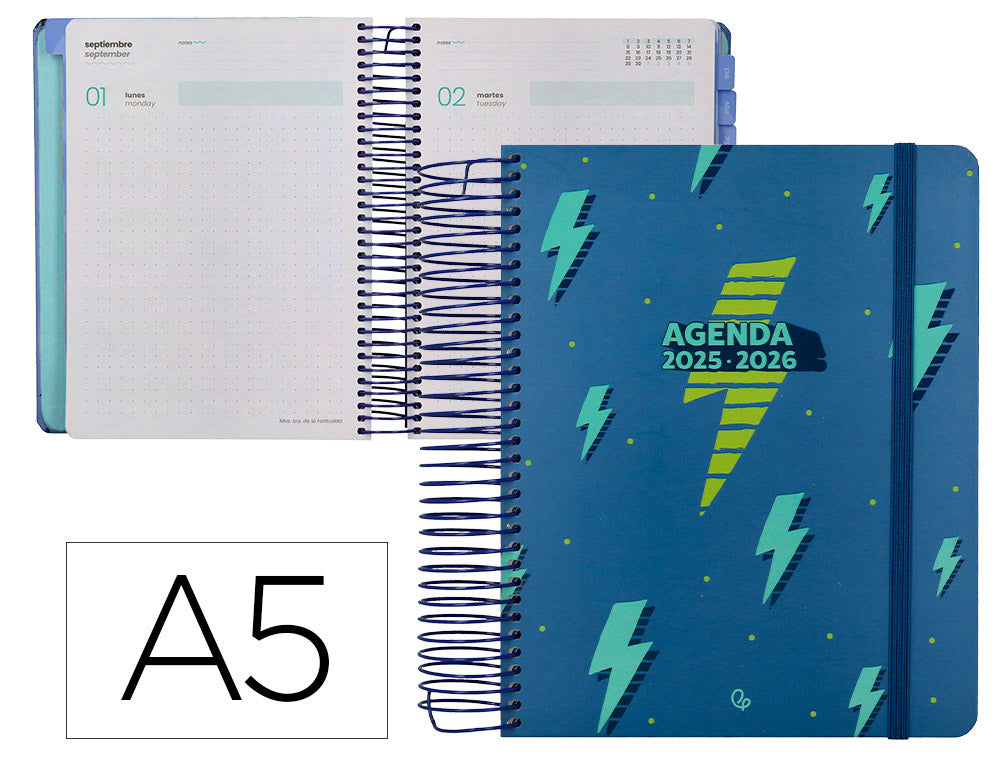 Agenda escolar liderpapel 25-26 espiral patterns rayos azul dia pagina a5 bilingüe papel fsc 80 gr