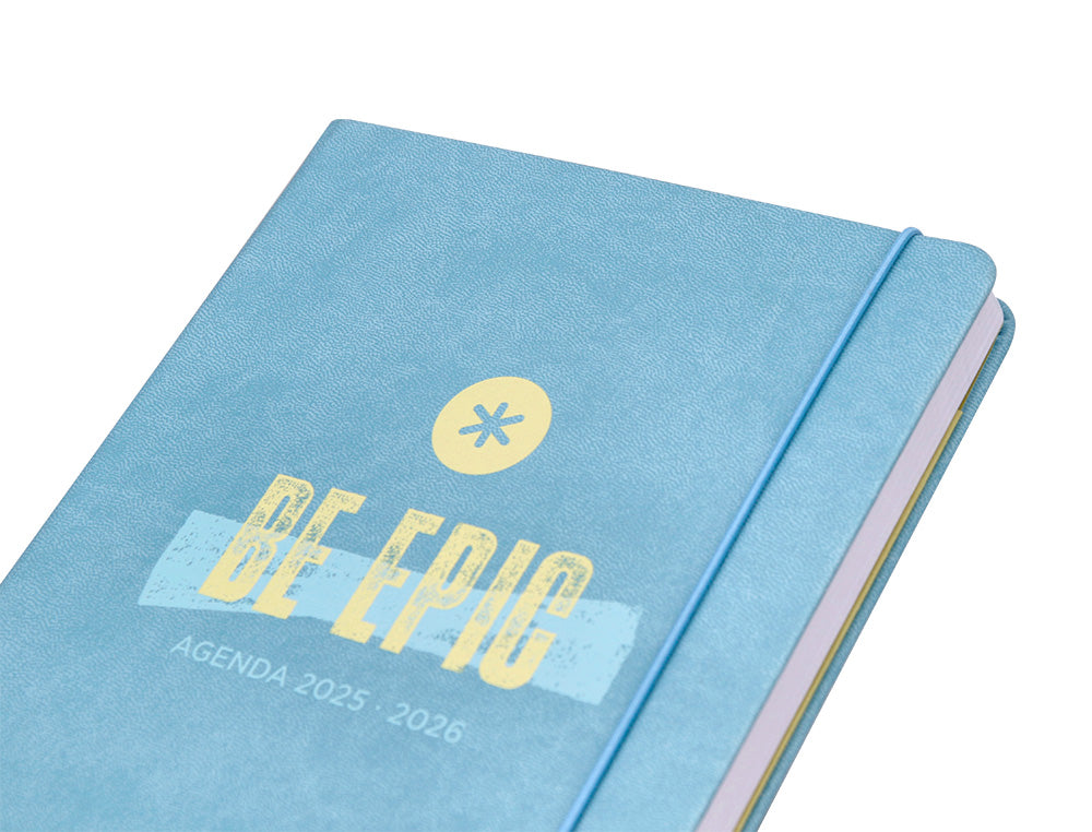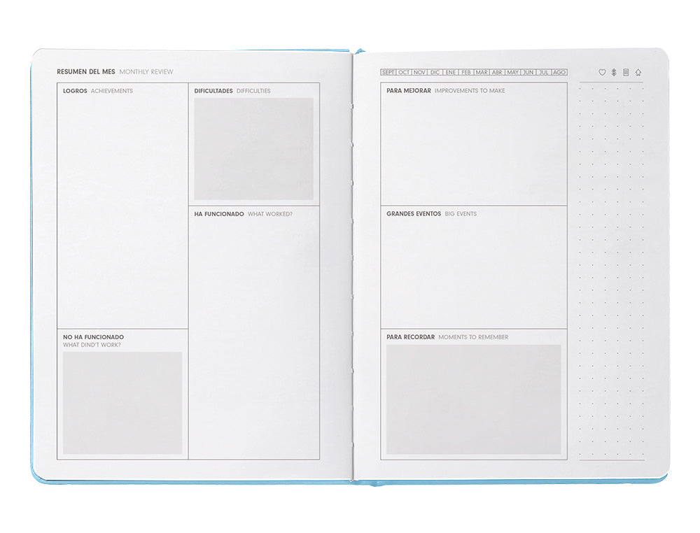 - Encuadernación y Material: Cuenta con una encuadernación de simil piel en color azul, combinando elegancia y durabilidad para resistir el uso diario.