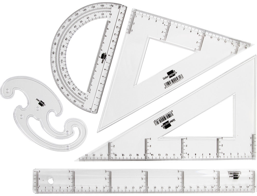 El juego de herramientas de dibujo y medición de la marca Liderpapel es un set completo ideal para estudiantes, profesionales de la ingeniería, arquitectura, dibujo técnico y manualidades. Este kit incluye una escuadra, un cartabón, una regla, un semicírculo y una plantilla de curvas, todos ellos diseñados para facilitar diversas tareas de dibujo técnico y precisión en mediciones.